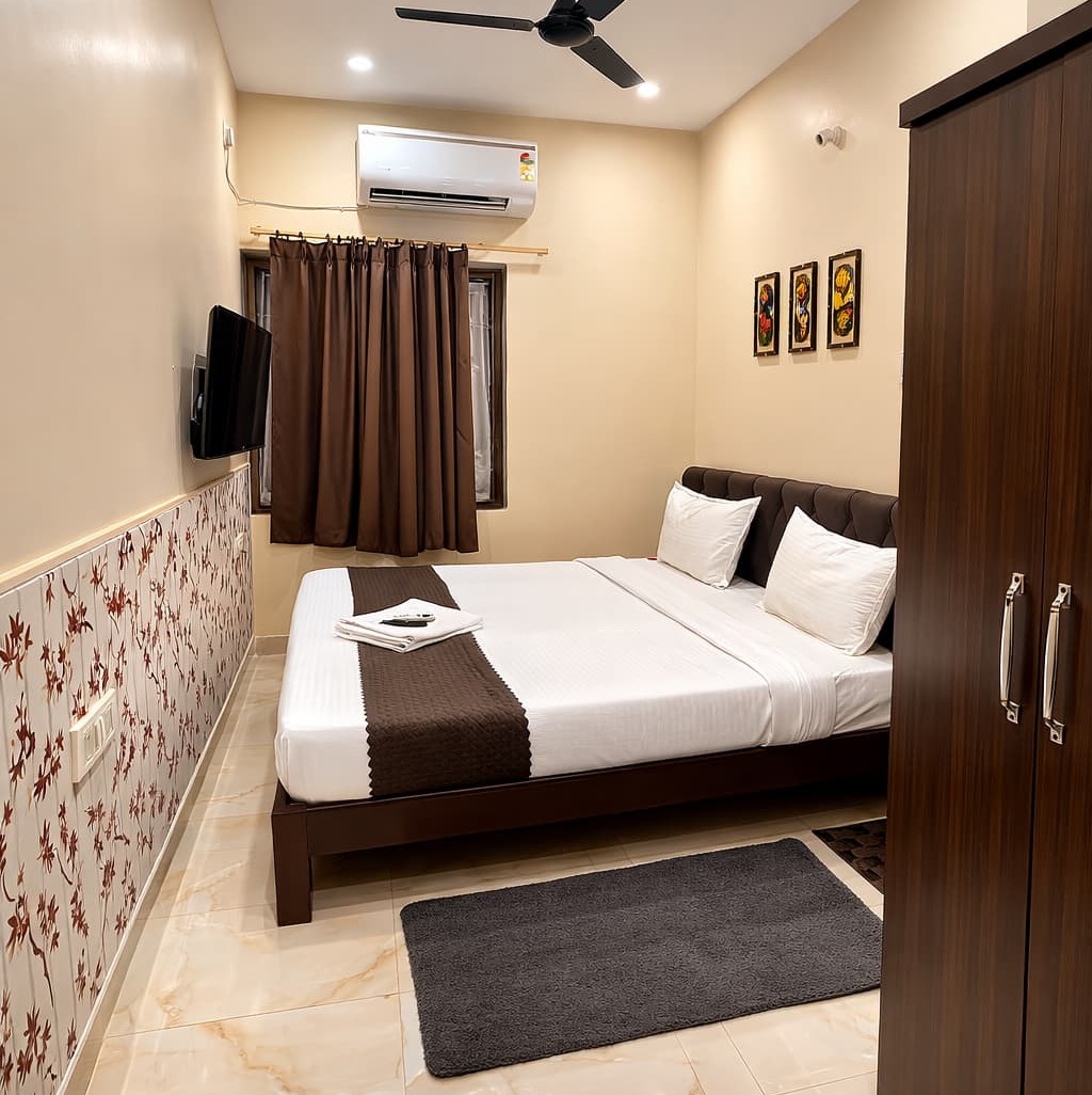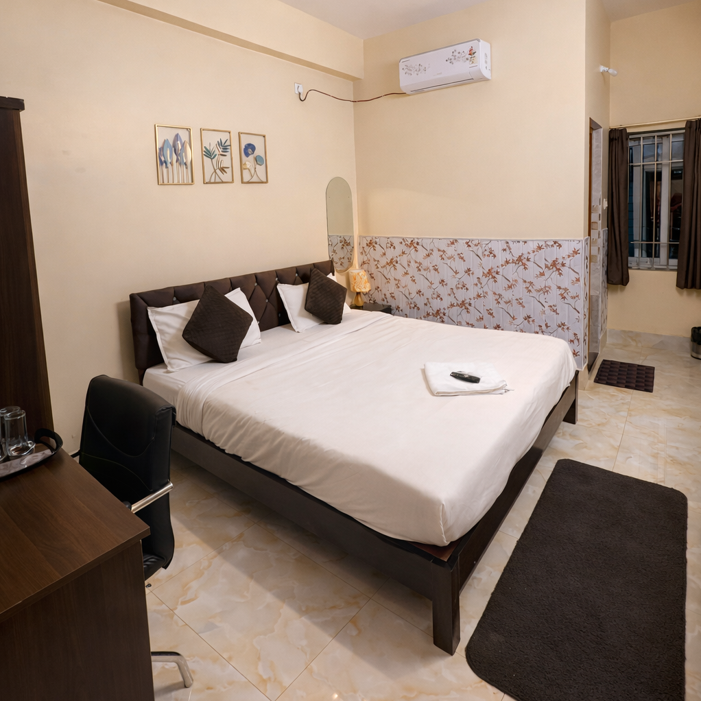 A cozy and budget-friendly room designed for a comfortable stay. Equipped with essential amenities like AC, Wi-Fi, and a comfortable bed—perfect for solo travelers or couples.
